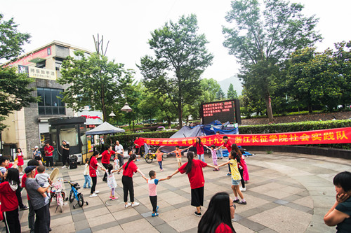 此次活动分为理论宣讲和关爱留守儿童两部分。宣讲活动主要以向社区居民派发宣传资料、纪念品和交谈相结合等丰富多彩的方式,宣传习总书记 “四进四信”与“5·3”视察中国政法大学重要讲话精神。同时,志愿者们还进行了关爱留守儿童的活动,通过和孩子们手牵着手做游戏,一起跳舞等方式让孩子们感到身边的快乐与温暖。