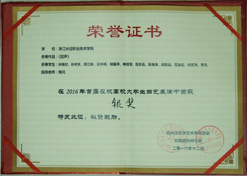 2016年12月,我院在由杭州市文联、共青团杭州市委主办的“首届在杭高校大学生曲艺展演”活动中获得“组织奖”。我院艺术团参赛作品《回声》获得“2016年首届在杭高校大学生曲艺展演银奖”。