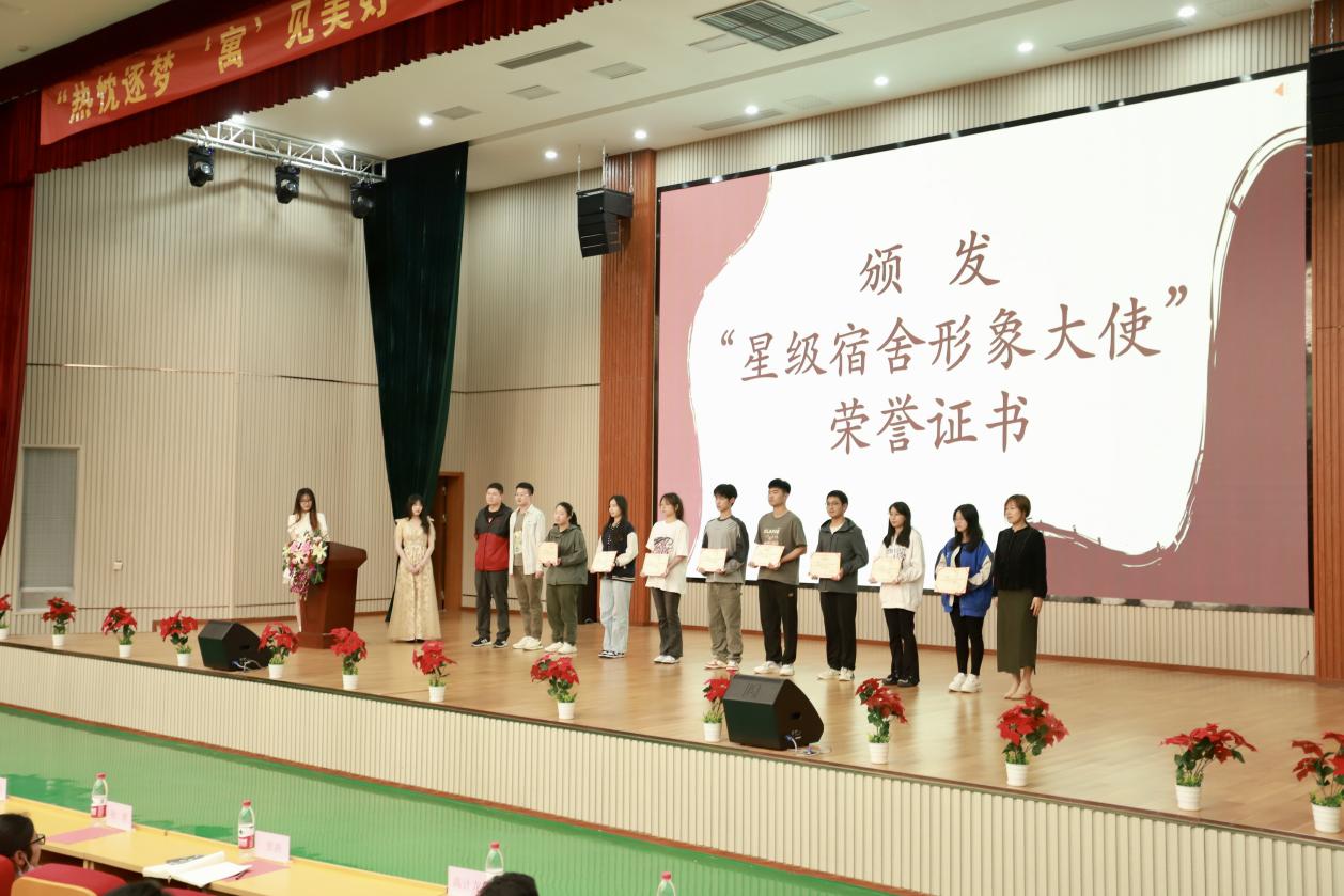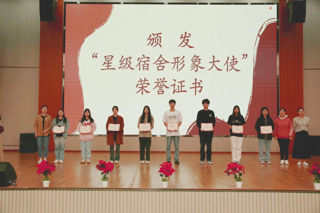 开幕式上,参会领导为获得“星级宿舍形象大使”荣誉进行颁奖。