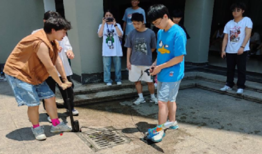 比赛现场,同学们齐心协力地制造“水火箭”、注水、打气,随着参赛选手按下发射器,“火箭”呼啸升空,夹杂着周围观众的惊呼和叫好声盘旋在场地上空。经过激烈角逐,由江旭辉、陶禹安、董文杰组成的“深藏blue队”获得一等奖,由彭银芝、叶彤组成的“啊对对队”获得二等奖,王昊洋的“对方正在输入中”队获三等奖。